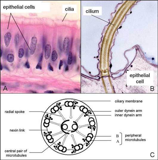 (i.e. weeks to months). Although the respiratory system signs are usually the most important, several signs related to pathology in other tissues with ciliated epithelia or microtubules can occur, such as otitis media, infertility in males and females, hydrocephalus, and renal fibrosis or dilation of renal tubules. Some dogs with PCD may present the "Kartagener's syndrome" which represents a triad of signs that includes bronchectasis, complete transposition of viscera (situs inversus) and chronic rhinosinusitis. While PCD may be suspected based on history, clinical signs, diagnostic imaging and endoscopy, final diagnosis requires the observation of ciliary structure abnormalities after ciliogenesis (i.e. culture of ciliated cells) of biopsies of ciliated epithelium (i.e. the nasal, tracheal or bronchial mucosa) with the use of transmission electron microscopy.