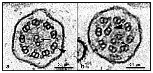 a. Normal ciliary axoneme with one central pair of microtubules (arrow) and nine peripheral microtubular doublets (arrow head).