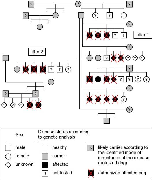 Litter history and pedigree analysis: Pedigree analysis of the two affected litters indicated that the sire of the first litter was the grandsire of the second litter. Further breeders information and pedigree examination revealed finally six affected related litters. Initial pedigree analysis was compatible with a monogenic autosomal recessive pattern of inheritance of a genetic defect. A genetic defect is a mistake in a gene called a mutation. There are basically two kinds of mutations, dominant and recessive. Every cell in the body (except sperm and eggs) has two copies of each gene (one from the sire, and one from the dam). A dominant mutation is where one defective copy of a gene is enough to affect the individual, whereas a recessive mutation requires that both copies of the gene carry a mutation for the individual to be affected. In other words, if the dog is only carrier, i.e he has only one defective copy of a gene, he will be clinically healthy. Here the disease is recessive, in consequence, in theory, if both parents are carriers, 25% of the puppies will be healthy, 50% of the puppies will be carriers and 25% of the puppies will be affected. If only one of the parents is carrier, 50% of the puppies will be carriers. In other words, to get affected puppies both parents need to be at least carriers.