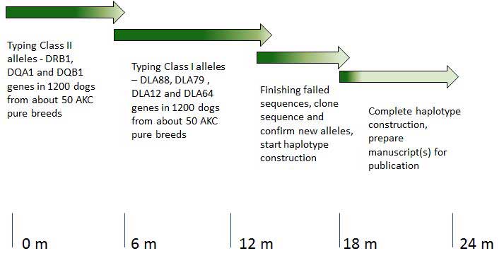 Aim 1 is about 90 % complete and Aim 2 is also about 90 % complete. Work on Aim 3 is in progress. Work on Aim 4 will commence shortly. Allele identities have been established for all the three class II genes, viz., DRB-1, DQA-1 and DQB-1 in over 900 dogs. Many new alleles have been found for all three genes. Allele identities have been established for two of the 4 class I genes, viz., DLA88, and DLA79 in over 900 dogs. Many new alleles have been found for both of these genes. Typing DLA64 and DLA12 genes is nearing completion. Haplotyping analysis will commence shortly.